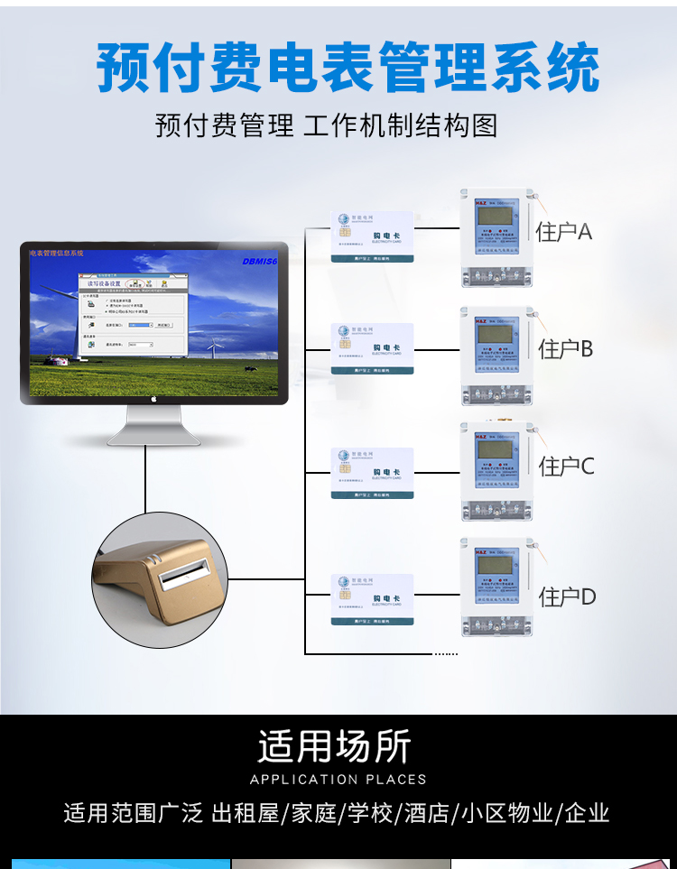 7、購(gòu)電方式:售電時(shí),將IC卡插入IC卡讀寫器,同時(shí)操作計(jì)算機(jī),將用戶編號(hào)、預(yù)購(gòu)電量、報(bào)警電量、限容方式及限容功率等加密寫入IC卡。