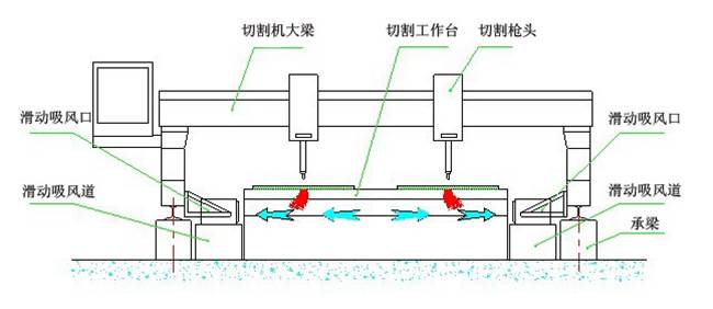 側吸式煙塵凈化系統(tǒng)采用吸風口固定在切割機龍門架上,吸風口與吸風道之間通過密封皮帶密封,吸風口可隨龍門架在吸風道上來回移動吸風,將切割的粉塵吸除。