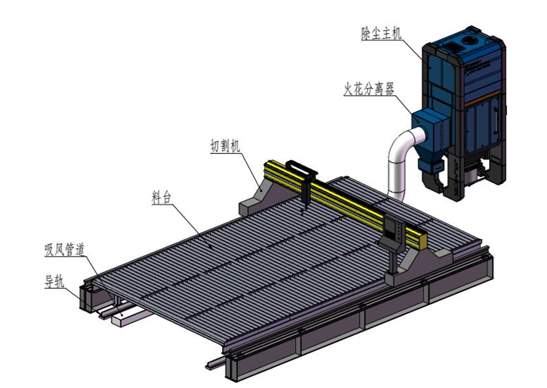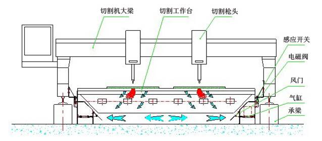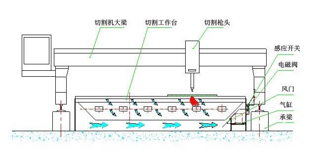 下吸式煙塵凈化系統(tǒng)抽風是通過下吸式抽風切割臺來實現(xiàn)的,下吸式抽風切割臺分成若干個區(qū)域,每個區(qū)域設計有風門吸風,切割槍頭在每個區(qū)域切割時,相應區(qū)域的風門打開抽風,將切割機的粉塵吸除。